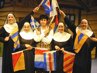 This time around, the merry Sisters are onboard a Faith of All Nations Cruise when the shipboard cast of "Fiddler On The Roof" takes ill. All except leading man Howard. So the ladies in black decide to help out, join Howard (still in his Tevye get-up) and entertain the folks. Over the course of two acts, the nuns dabble in yiddish, dance a polka, present magic tricks, sing about being fat and drag out a ventriloquism act. The songs aren't particularly engaging and the jokes aren't particularly clever. After all, there are only so many ways you can push the hackneyed "Catholics vs. Jews" joke. And Goggin should be able to come up with something better than musty Mae West references. The only time "Meshuggah-Nuns" shows any genuine heart is in the second act number "A Love Like This" as Howard (Frank Gayton) and Sister Robert Anne (Maryann Zschau) reminisce about their lives and loves. Bottom line -- you've got to know when to retire an idea that's adrift. "Meshuggah-Nuns" is at Lyric Stage, 140 Clarendon Street in Boston through December 27. For information, call 617-437-7172." Production Photo: Spiro Veloudos -- OnStage Boston 12/4/03 |