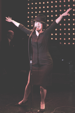 McLean has taken those taped thoughts (known as Judy Speaks) and crafted them into a 30 minute scene reenacting Judy's attempt at recollecting her life. The evening begins with Judy's own voice playing through the sound system in the dark. When the stage lights come up, St. George is dressed in white silk pajamas, and she's pacing the stage, wrangling the microphone cord of the tape recorder in much the same manner Garland wrestled the microphone cord on stage. Stretching it, tangling it, and slinging it over her shoulder. She rambles, she slurs, she rants and she admits to being a good person and a good mother. She condemns those who have wronged her from managers to ex-husbands and columnists. Still she, and the show, went on. As she said, "When my number is up, I want a new one." Basing the first section of the show on actual recordings is a good news-bad news deal. Remaining faithful to Garland's own words grounds the show in fact. However, as Garland's thoughts weren't particularly profound, it sacrifices the opportunity to dramatize the monologue by fleshing out her thoughts and opinions. Then we slip from Private Judy to Public Judy. The stage darkens, an overture begins and three minutes later, Judy returns in concert. St. George is now decked out in a series of outfits (designed by Charles Schoonmaker) of the style Judy wore on stage and for her ill-fated CBS television series. The mannerisms are authentic, the gestures are real and the look is sharp. St. George also does a credible great job channeling Judy's humor. The concert section, with the nimble Tim Evans at the piano, takes a memory-lane stroll through some of Garland's best loved numbers from "You made Me Love You" and "The Trolley Song" to "For me And My Gal," "This Can't Be Love," "Chicago," "A Couple of Swells," "Get Happy" (above) and a moving "The Man That Got Away." She closes with the obligatory "Over The Rainbow," sitting on the edge of the stage as Garland always did. The applause that follows is also in keeping with a Garland appearance. The crowd is on its feet, the star bows graciously and the experience is over. She had a serious romance with her audiences and she lived for and in performance. Appropriately, "Ladies And Gentlemen" officially opened on June 10 -- Judy Garland's own birthday. "And Now Ladies And Gentlemen: Miss Judy Garland" at Lyric Stage, 140 Clarendon Street in Boston. For information, call 617-585-5678. Production Photo: Paul Lyden -- OnStage Boston 06/14/07 |