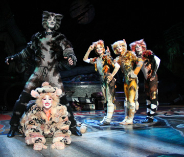 Written by Andrew Lloyd Webber and Tim Rice, "Cats" is based on T. S. Eliot's Old Possum's Book of Practical Cats. While sung through, this is a show that's all about dance. Trevor Nunn's original direction was sharp and precise while Gilliam Lynne's demanding choreography was graceful, athletic and totally in keeping with the feline mystique. Richard Stafford directs and choreographs with that in mind for the tour. The premise of the show is as thin as a whisker. On one very special night every year, an assortment of Jellical cats gather in a junkyard to vie for the chance to be re-born. Led by Old Deuteronomy (Philip Peterson), the patriarch of the group, the dusk to dawn gathering allows us to meet and learn the stories of all those in attendance. They include: Rum Tum Tugger, the hip-swiveling tom cat lothario (Adam Steiner), Gus, the old stage door cat (Nathan Morgan); Jennyanydots, a chubby, tap-dancing gumbie tab (Jennifer Cohen); Skimbleshanks, the railway cat (John Jacob Lee), the magical Mr. Mistoffelees (Chris Mackenthun), Bustopher Jones, an officious old guy fond of spats (also Nathan Morgan); and an inquisitive team of cat burglars, Mungojerrie (Brian Bailey) and Rumpleteazer (Kristen Quartarone).